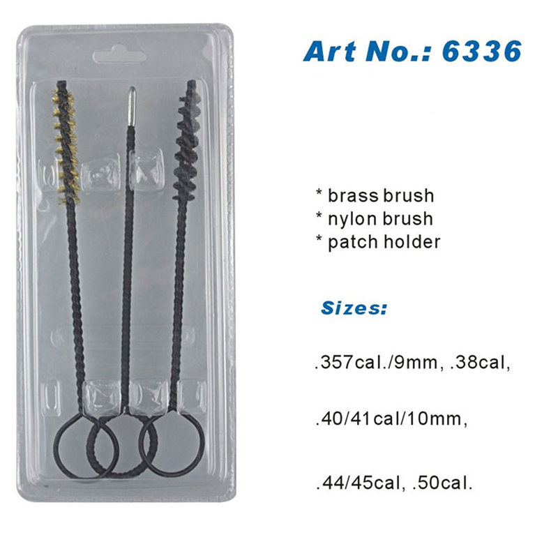 3 pcs set handgun cleaning kit , packed in double blister. One brass bore cleaning brush , one nylon bore cleaning brush and one slotted patch holder. Handy and effective.
