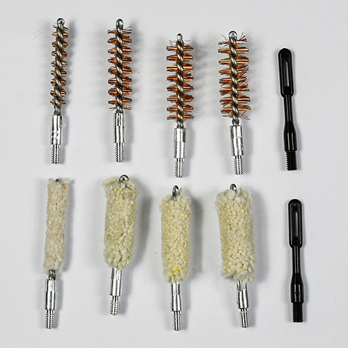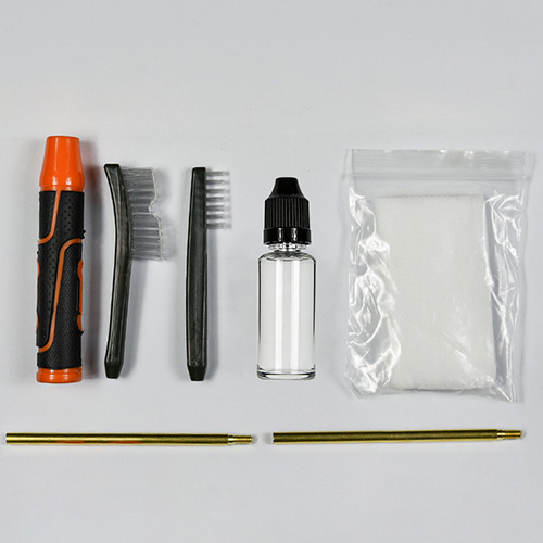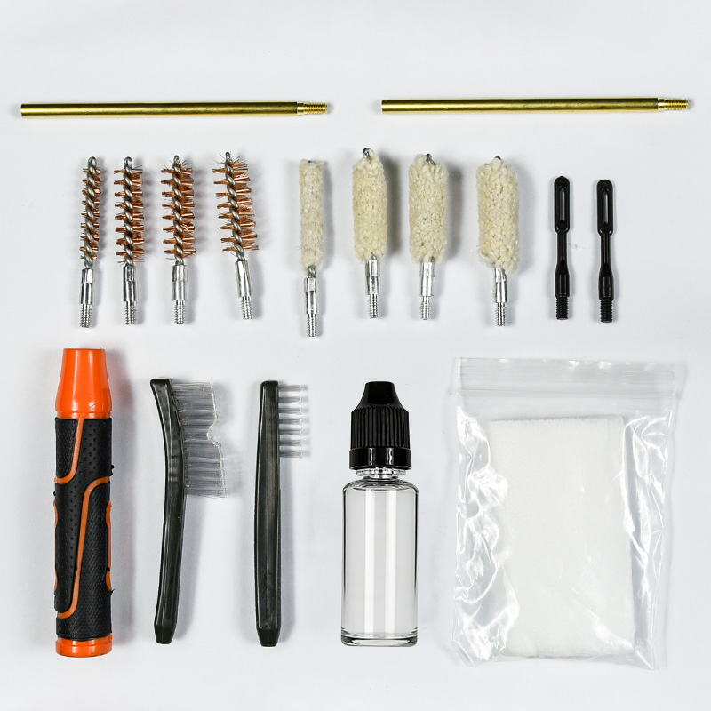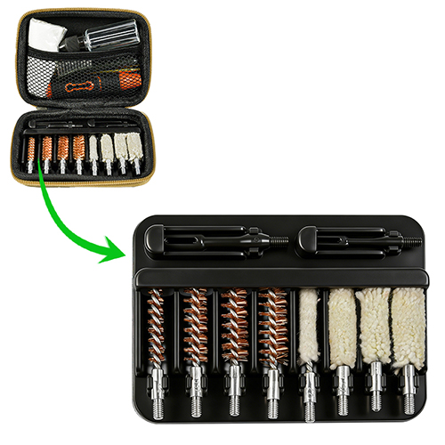 Handgun cleaning kit includes 4 sizes (.22, 9mm, .40, .45cal.). OX cloth coated PVC case with zip. Brass brushes and cotton mops, 2 rods. Sands and black color for choices.