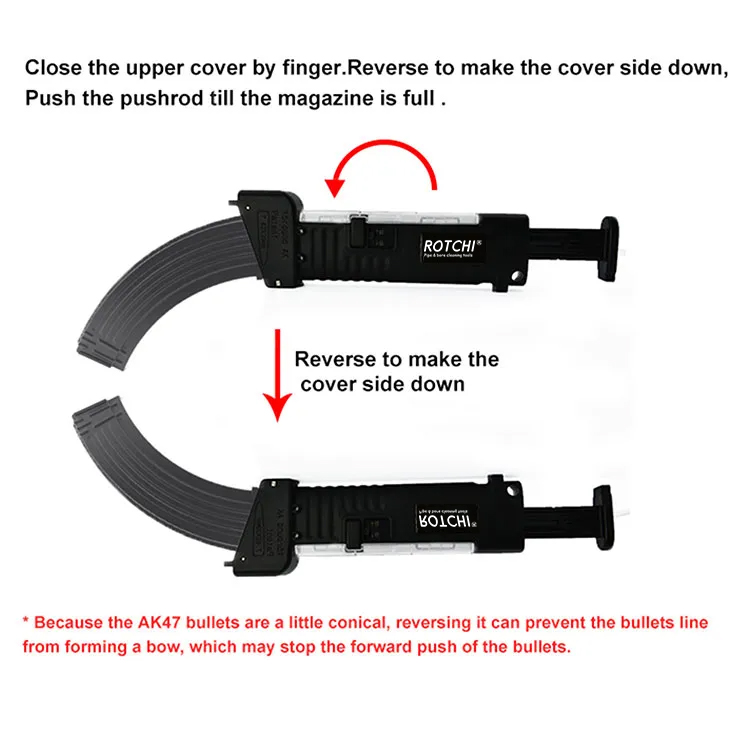 Magazine Speed Loader for AK47 ● Used to load 7.62X39mm cartridges into AK magazine in capacity 10/20/30 or more bigger. ● Fill the cartridges full in the groove, install the magazine on same like AK mechanical principle. push the pusher , the cartridges will enter the magazine easily. ● Easy operate , a girl can do very fast. ● Strong body. You can see the cartridges inside the loader through the ransparant cover. A lock controls the cover not to open during storage. ● It can also unload the cartridges from the magazine when you won’t shoot but the magazine is still full.