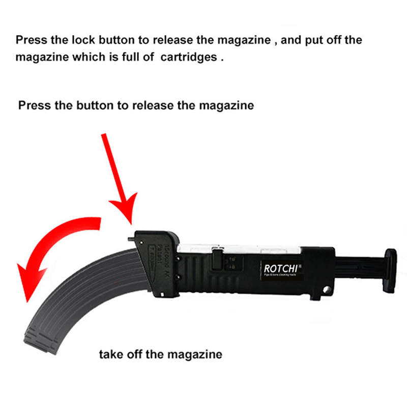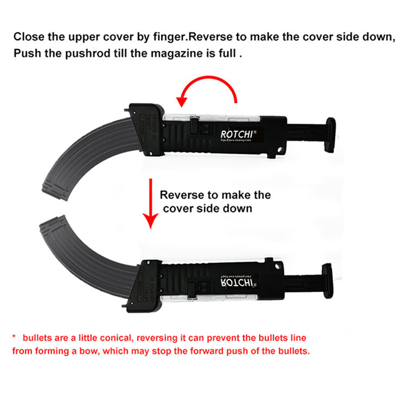 ● Fill the cartridges full in the groove, install the magazine on same like AK mechanical principle. push the pusher , the cartridges will enter the magazine easily.