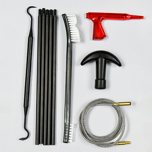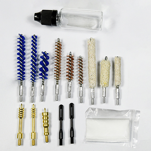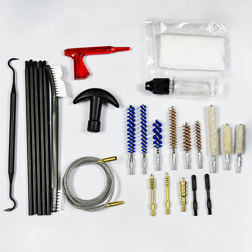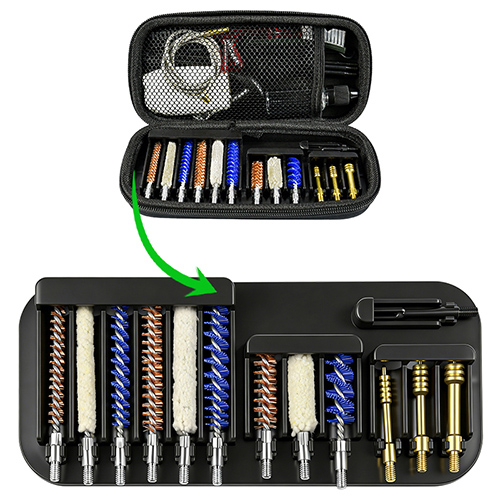 Rifle and Handgun cleaning kit includes 3 sizes ( .22cal. .30cal. 9mm). OX cloth coated PVC case with zip. Brass brushes, cotton mops, nylon brushes, brass jags, 5 rods 1 calbe. Sands and black color for choices.