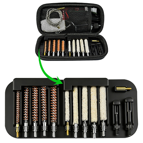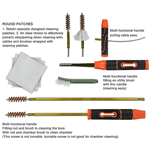 Rifle cleaning kit includes 5 sizes (.177, .22, .243, .27, .30 cal.), brass brushes and cotton mops, 5 rods, 2 calbes. Sands and black color for choices.
