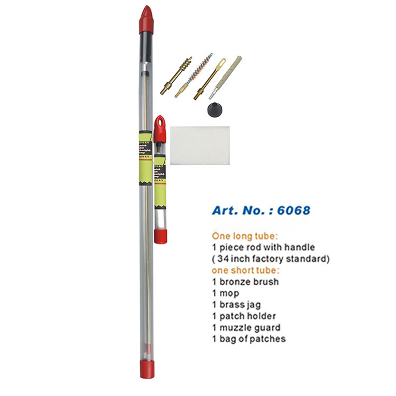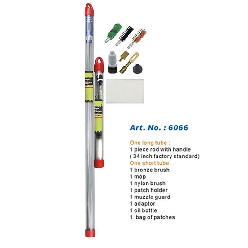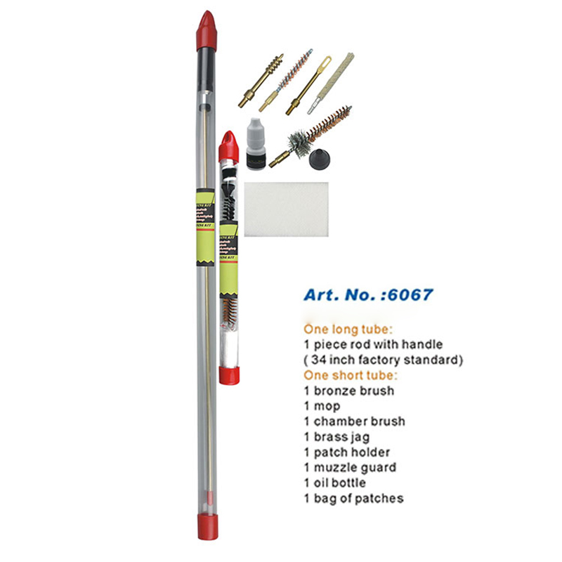 Rifle Cleaning Kit One Piece Long Rod Hanging Tube Pack ● One piece long rod 34 inch/860mm , no cutting, no step on rod. ● Heavey duty brushes and accessories good for bore cleaning. ● Rotating aluminum handle runs freely ● Long transparent tube packed, to take and store easily. ● Easy to put OEM or customer’s stick and logo on