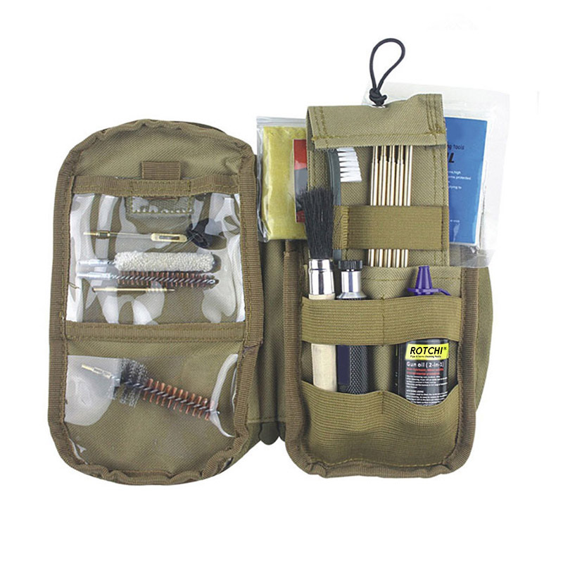 Tactical cloth bag gun cleaning kit . The bag ismade of high quality canvas and microfiber,with adjustablebelts and Self adhesive tapes for quickly pick up and go,big capacity for holdinggun cleaning accessories or touch or any other you want to put in. Completed cleaning tools fit for many caliber guns.